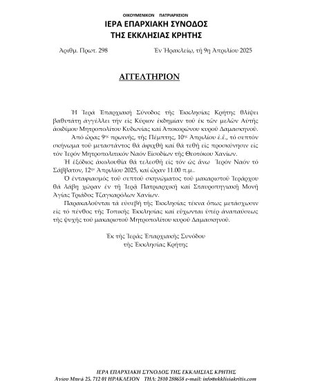 Ανακοινωθέν της Ιεράς Επαρχιακής Συνόδου της Εκκλησία Κρήτης για τις αναφορές περί οικονομικής συναλλαγής με το Κράτος